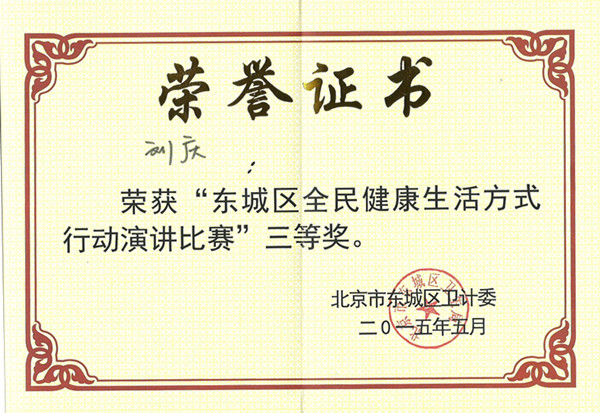 在此次比賽中,我公司一名員工以“健康一二一”即“日行一萬步、吃動兩平衡、健康一輩子”為演講主題,榮獲“東城區(qū)全民健康生活方式行動演講比賽”三等獎。